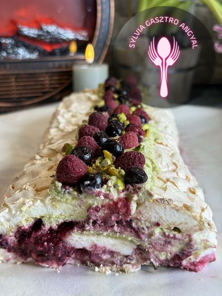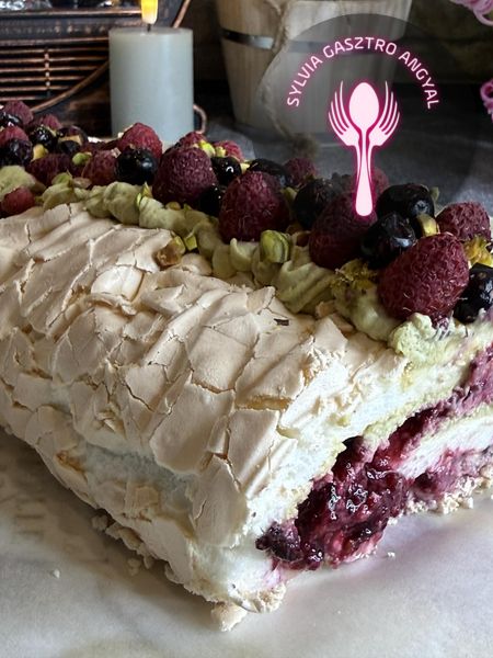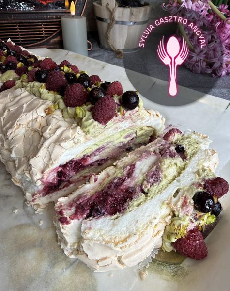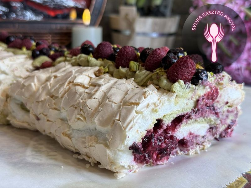 Ez a pisztáciás – gyümölcsös pavlova tekercs könnyed, légies desszert. Roppanós külsővel és lágy, krémes belsővel rendelkezik. A gazdag pisztáciás krém és a friss, savanykás gyümölcsök tökéletes harmóniát alkotnak. Elegáns, mégis frissítő finomság, ami garantáltan lenyűgözi a szeretteidet is!